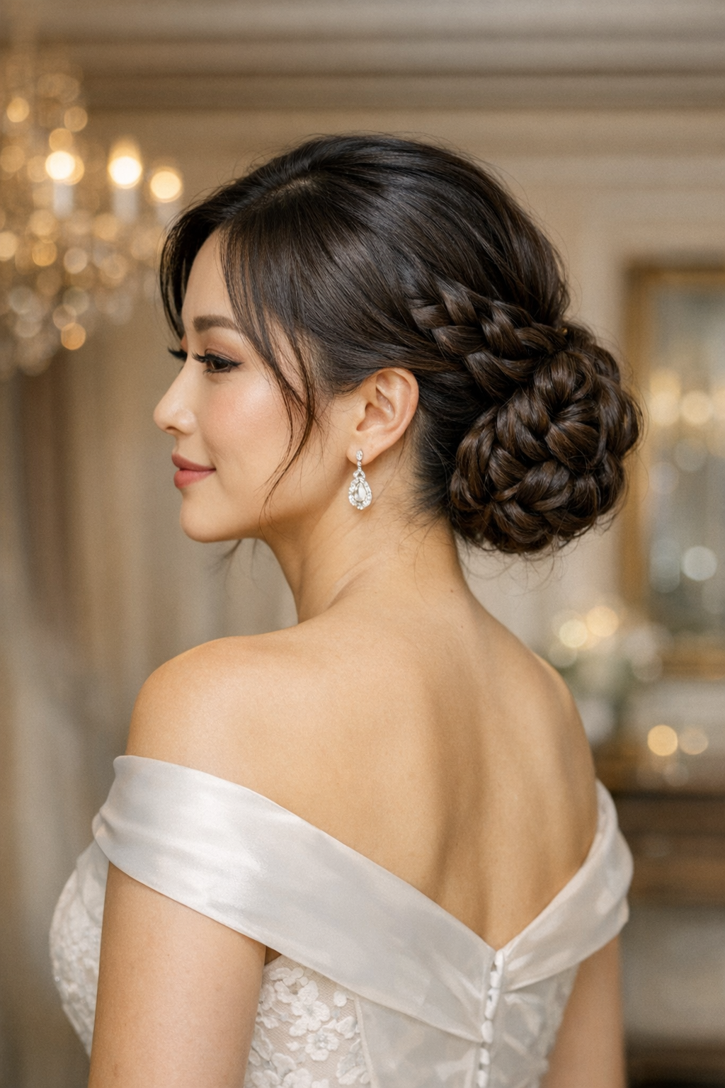 Braided High Bun is a polished bridal shape with a strong neckline and veil-friendly balance.