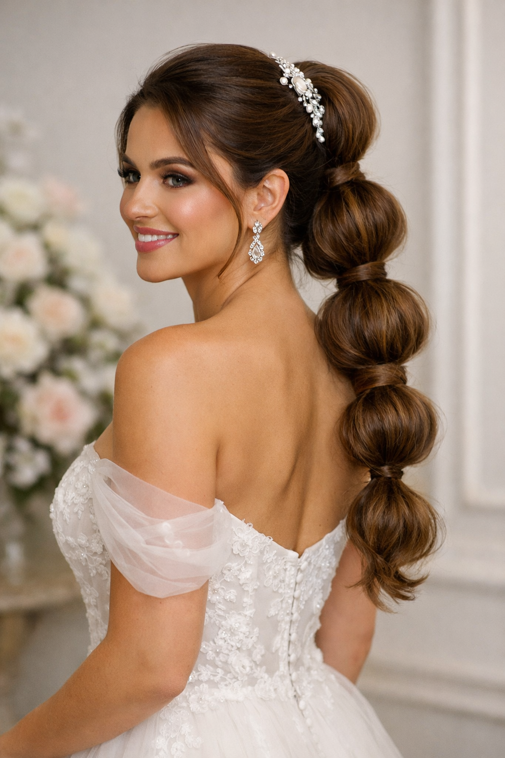 Bubble Ponytail is a sleek or textured bridal line that keeps the profile modern and camera-ready.