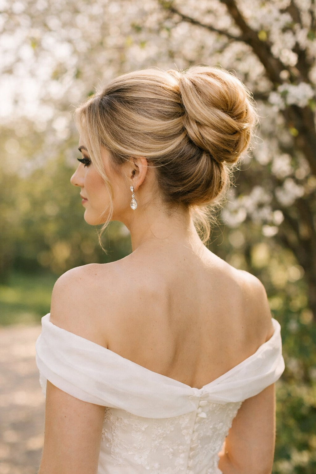 Curly High Bun is a polished bridal shape with a strong neckline and veil-friendly balance.