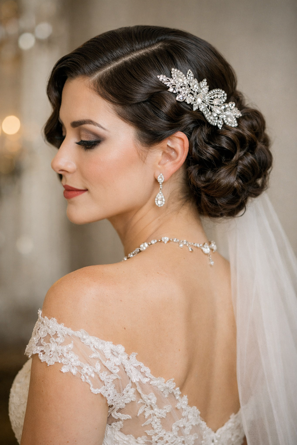 Finger Waves Bob is a shorter bridal silhouette built around finish, shape, and accessory placement.