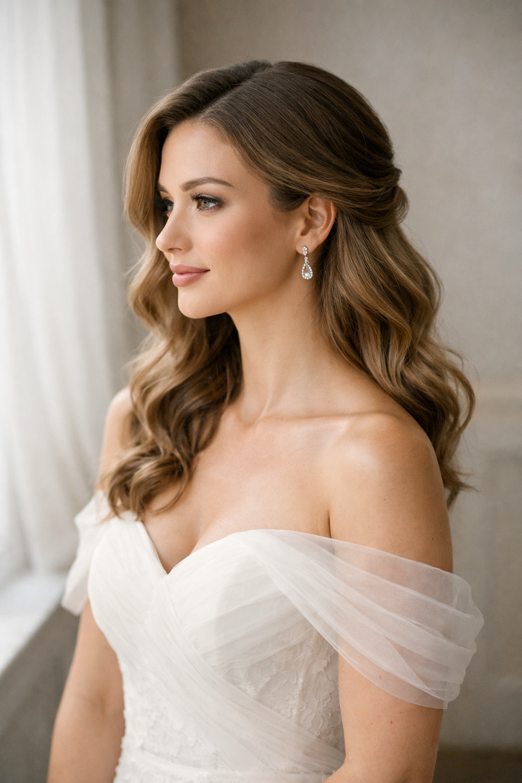 Glossy Soft Waves is an open bridal finish with shine, softness, and strong photo movement.