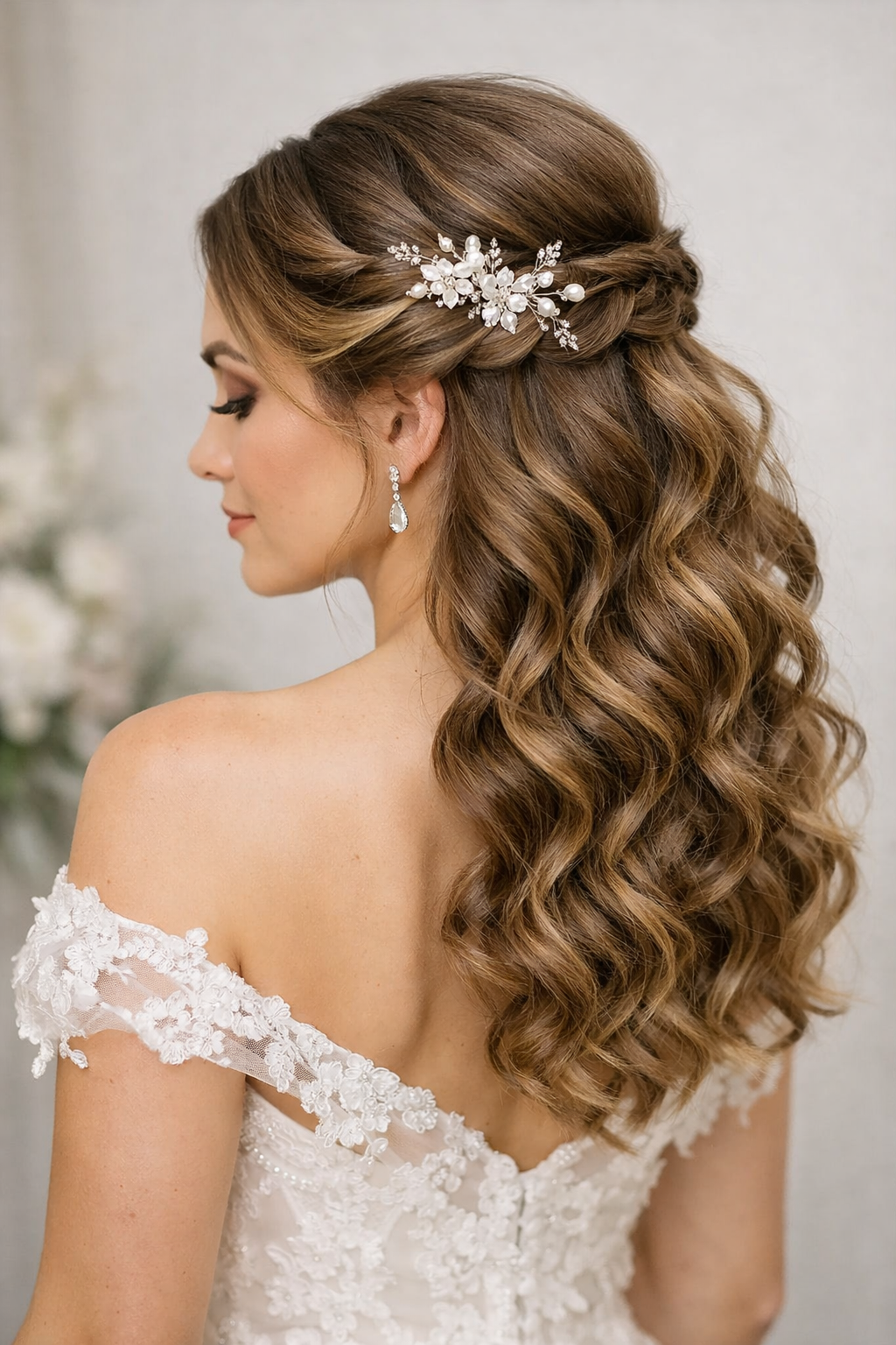 This family bridges open hair and structure, making it useful for veils, combs, and softer crowns. Half-Up Volume Curls stays ready for veils, jewelry, and bridal portraits without turning into a heavy gallery page.