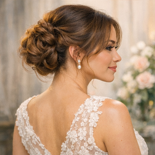 Knotless Braids Bun is a bridal look built on protective styling, clean parting, and ornament-ready shape.