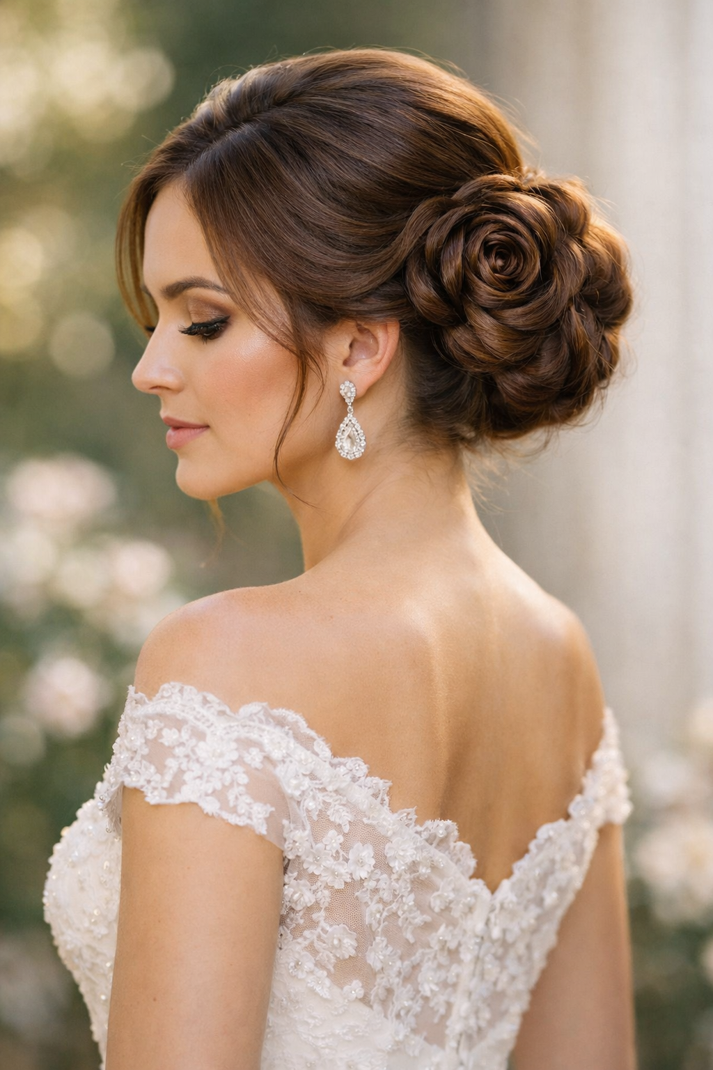 Messy High Bun is a polished bridal shape with a strong neckline and veil-friendly balance.