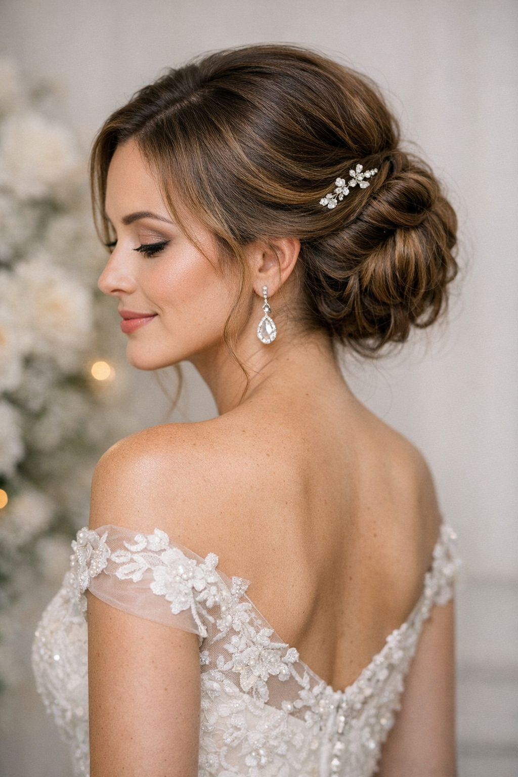 This family is about precise contour, shine control, and making shorter length feel intentionally dressed. Tucked Back Short Style stays ready for veils, jewelry, and bridal portraits without turning into a heavy gallery page.