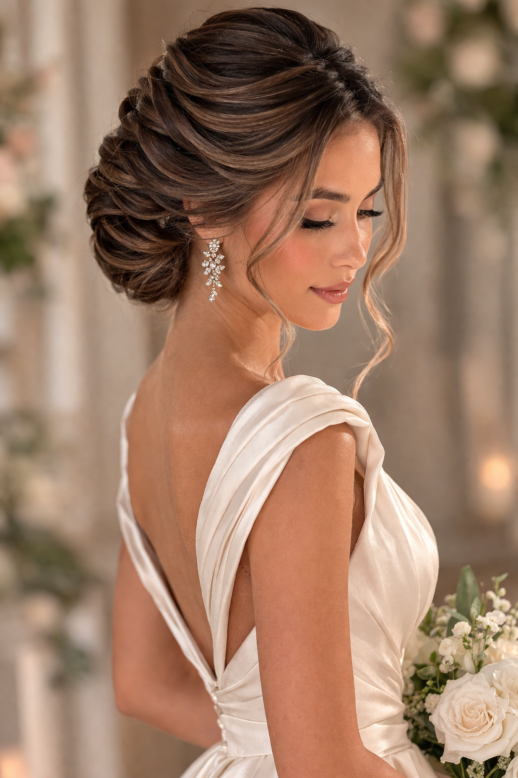 Vintage Updo is a sculpted bridal arrangement with texture, lift, and event-ready movement.